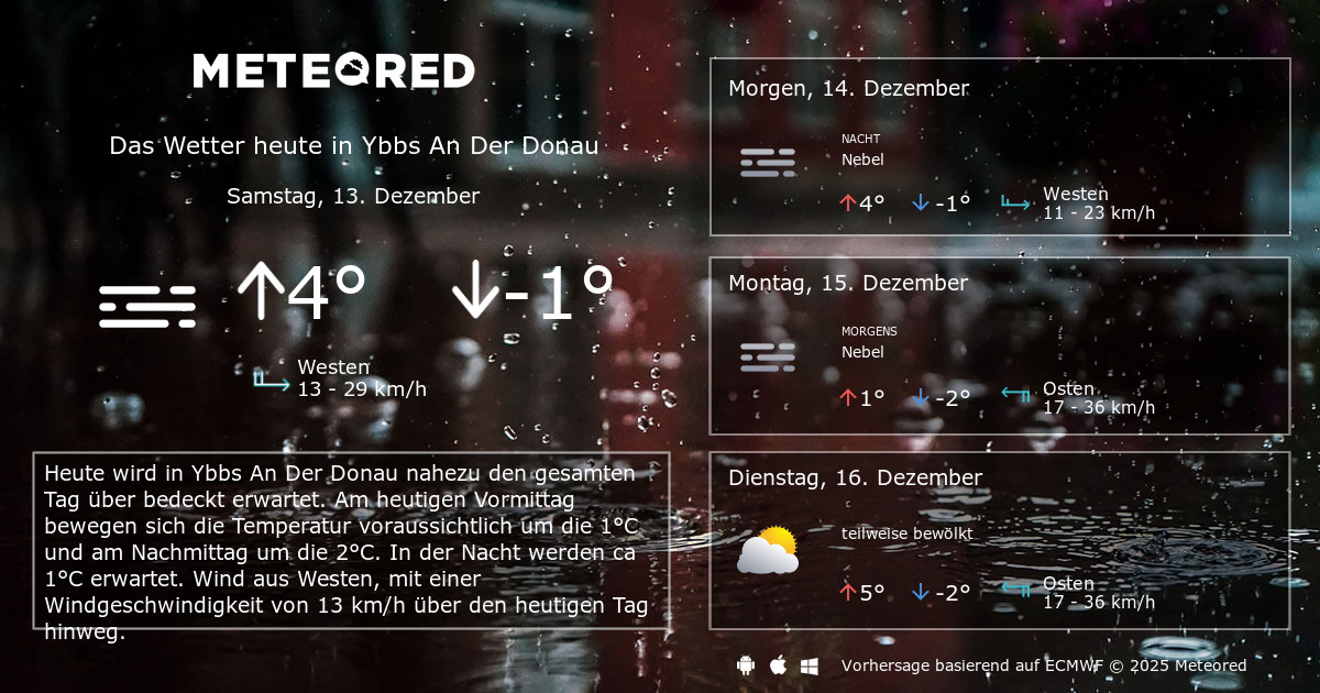 Es bietet informationen ber Windstrke Windrichtung Luftdruck Temperatur Luftfeuchtigkeit und Sichtweite in Ybbs an der Donau. Abends bleibt der Himmel in Ybbs an der Donau grau und es regnet und die Temperaturen liegen zwischen 3 und 4 Grad. 11032021 Unser 5-Tage-Meteogramm fr Ybbs an der Donau bietet alle Wetterinformationen in 3 einfachen Grafiken.